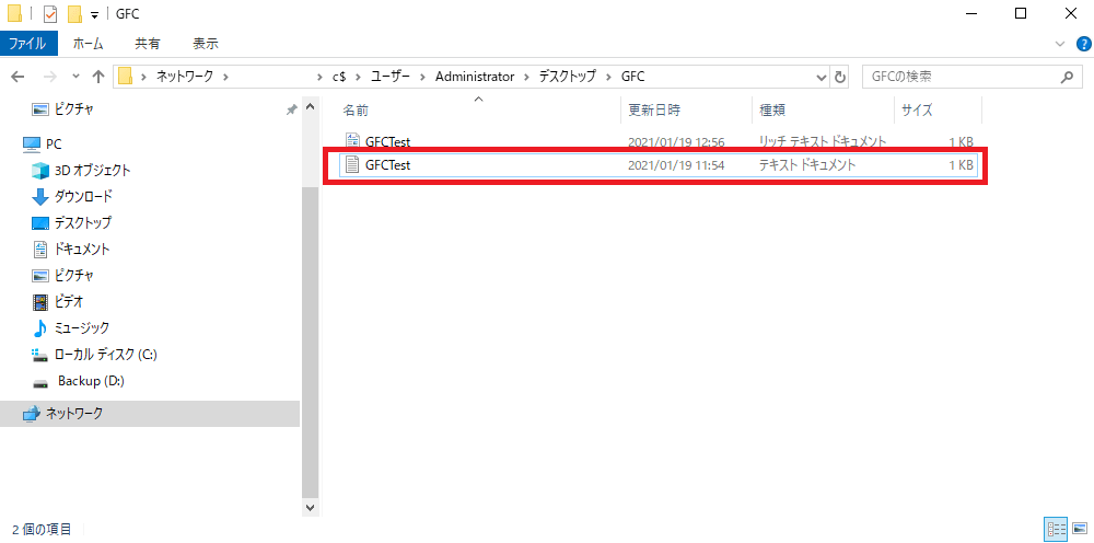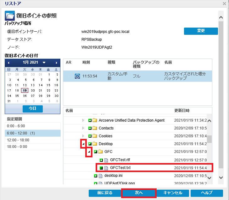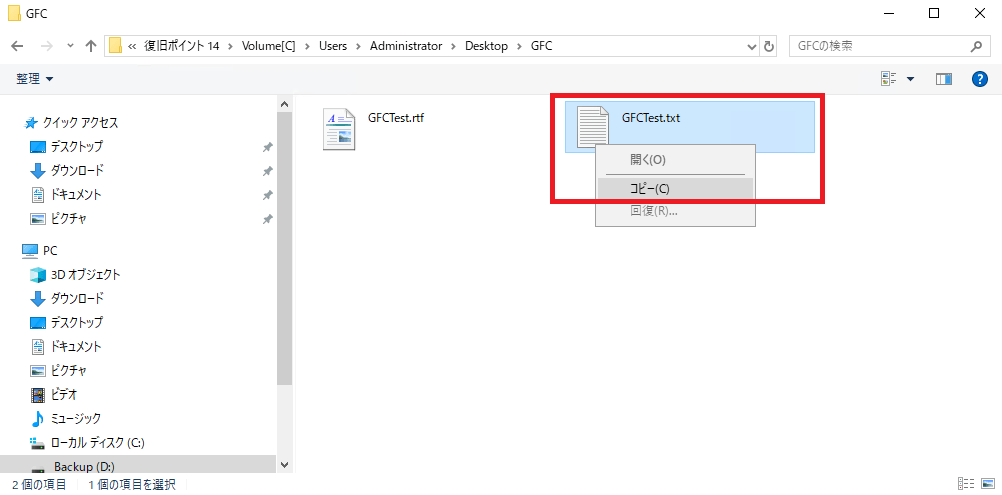 Agent サーバーにてデスクトップ上のフォルダに保存されているテキストファイルを誤って削除した際のリストア手順です。