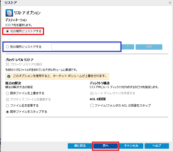 ※今回は”元の場所にリストアする”を選択していますが、”別の場所にリストアする”を選択することも可能です。![]()