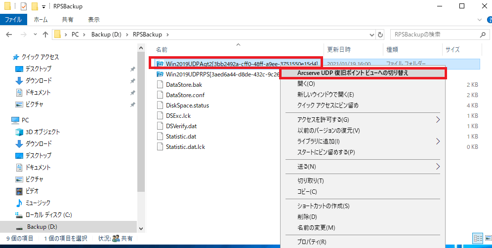 ①RPS サーバーにてエクスプローラを起動し、復旧ポイント(バックアップデータが保存されているフォルダ)を開き、ホスト名のファイルを右クリック、「arcserve UDP 復旧ポイントビューへの変更」をクリックします。![]()
