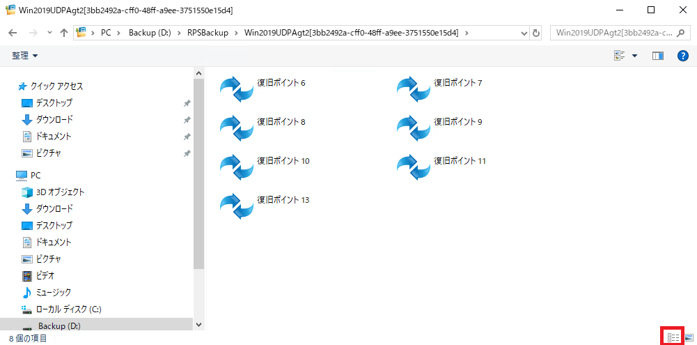 ③復旧ポイントの一覧が表示されるので、エクスプローラの詳細表示に変更します。![]()