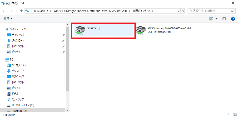 ⑤ボリュームが表示されるのでダブルクリックして、リストア対象のファイルが保存されているドライブとフォルダを展開していきます。![]()