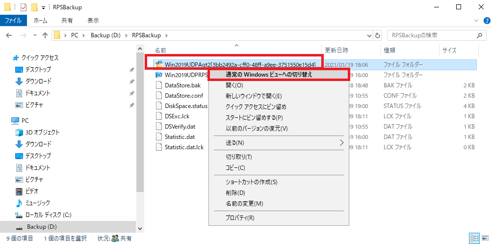 ⑨復旧ポイント(バックアップデータが保存されているフォルダ)を開き、ホスト名のファイルを右クリック、「通常のWindowsビューに変更」をクリックします。